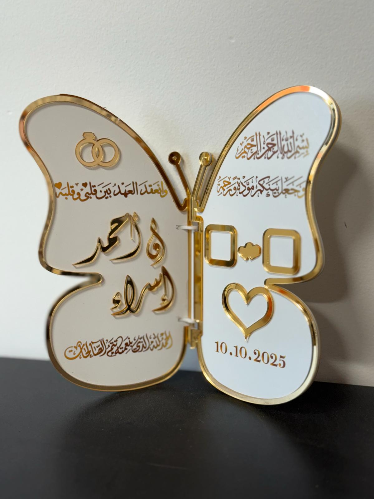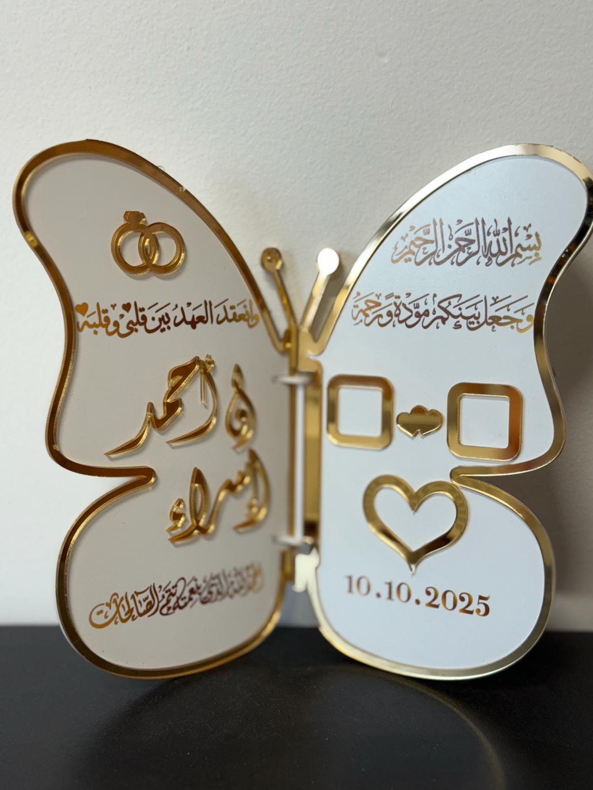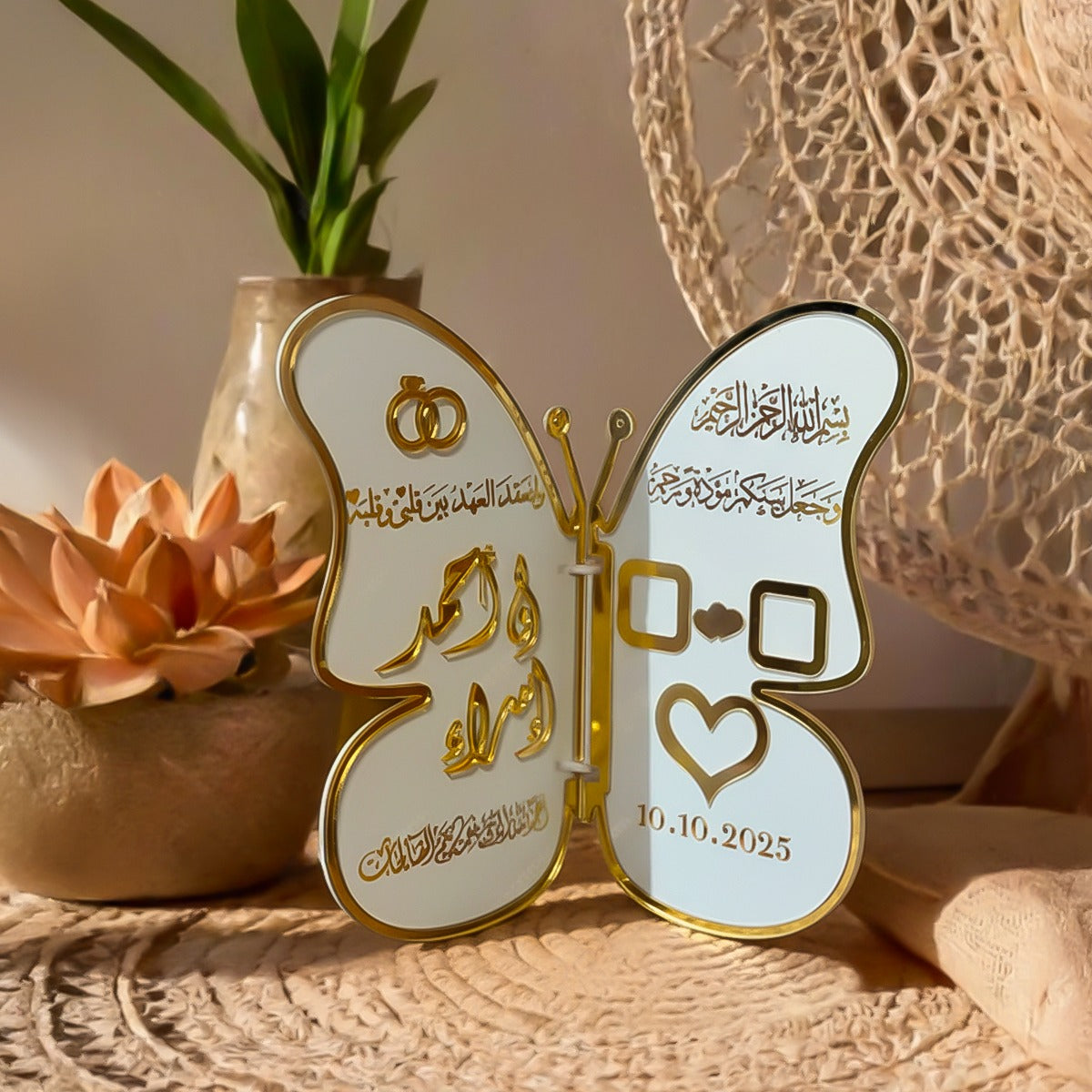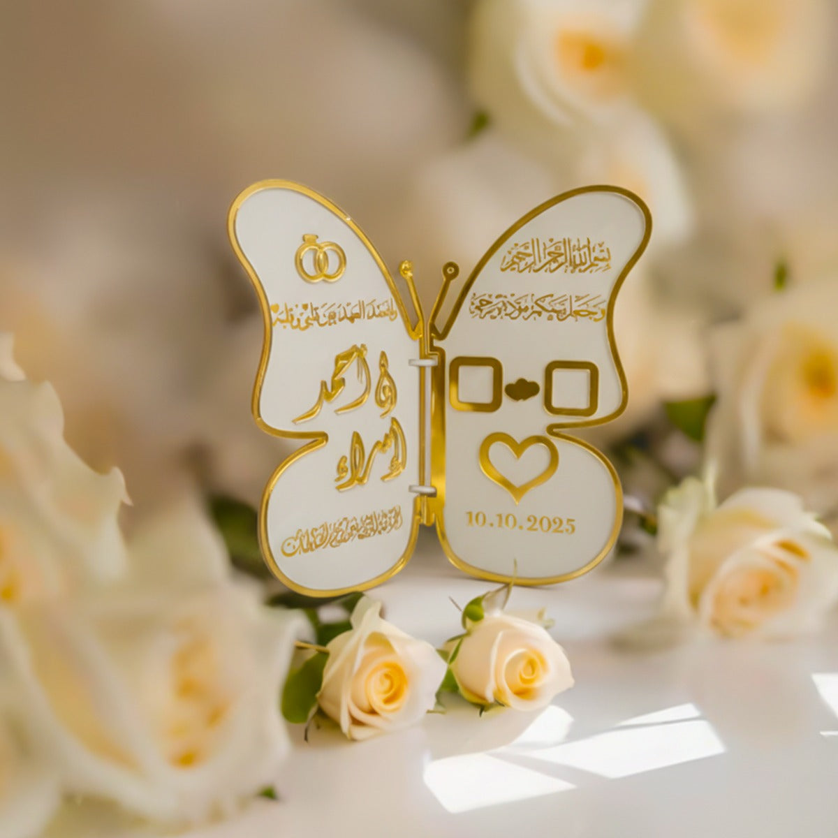 Symbolize love and transformation with our Butterfly Arabic Engagement Ring Holder. Crafted in a unique butterfly shape, this elegant piece features a premium acrylic finish with golden detailing, engraved Arabic calligraphy, and personalized...